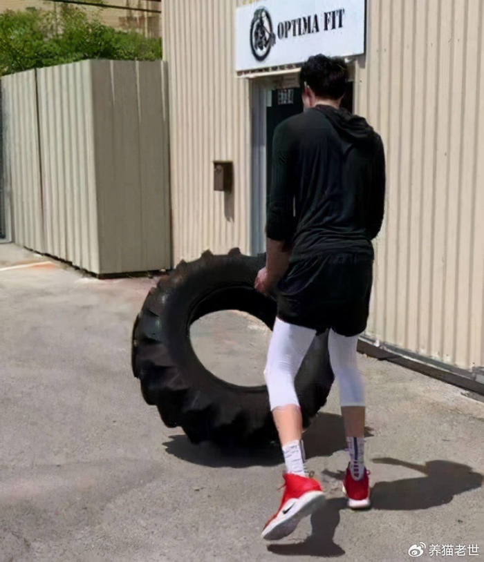 我们再来看看国内球员是如何用轮胎训练的,首先是易建联。尽管阿联在NBA没能打出来,但不可否认他仍然是当今中国男篮的一哥,同时也是继姚明之后最出色的国内球员。而易建联之所以能够常年保持如此出色的状态,在很大程度上得益于他极其自律的训练方式。相比于许多国内球员,阿联拥有着不逊色于欧美球员的肌肉线条,运动能力也是极其劲爆。从上图中就可以看出,易建联训练的轮胎尺寸与詹姆斯基本相差无疑,不过从表情上来看则显得有些吃力。